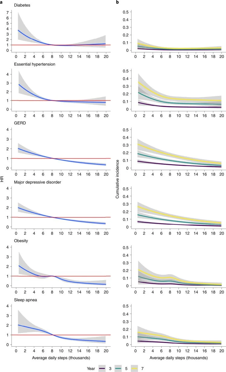 We often hear 10,000 steps as the standard recommendation to keep us healthy, this is around 8 kilometers of walking for the average person, which can take anywhere from 1.5-2.5 hours depending on your height, cadence, and other variables. There is scientific legitimacy to this recommendation of 10,000 steps. A recent 2023 study showing that getting your daily step count to 8000-9000 steps per day has been shown to have a host of benefits and is protective against diseases like GERD (acid reflux), Obesity, Diabetes, Sleep Apnea, hypertension, and much more. It doesn’t end at 8000 steps however, this study also saw increasing your step count to 10,000, you will most likely see greater protective effects for certain diseases, like an extra 31% reduction in the chance of being diagnosed with obesity.